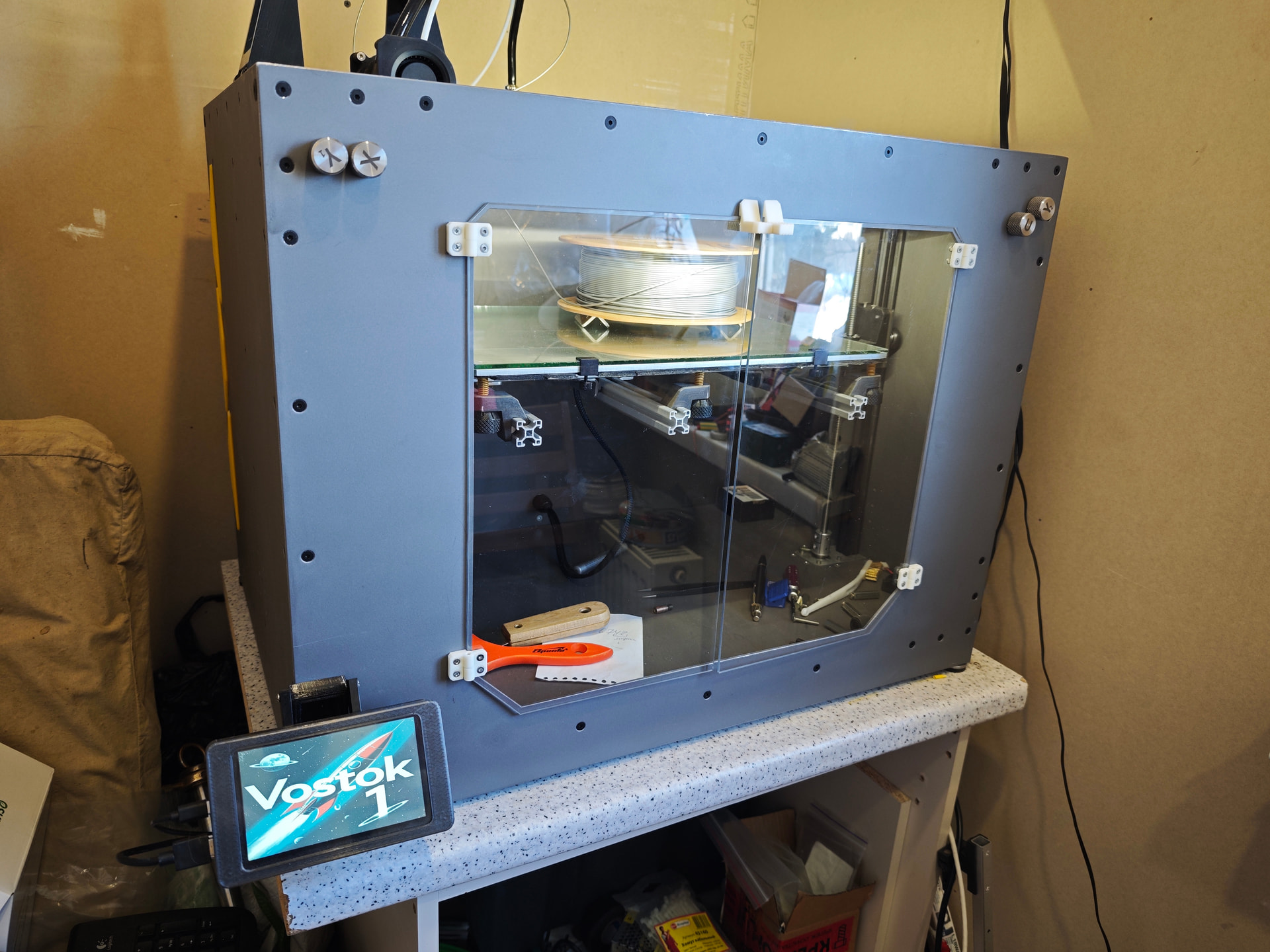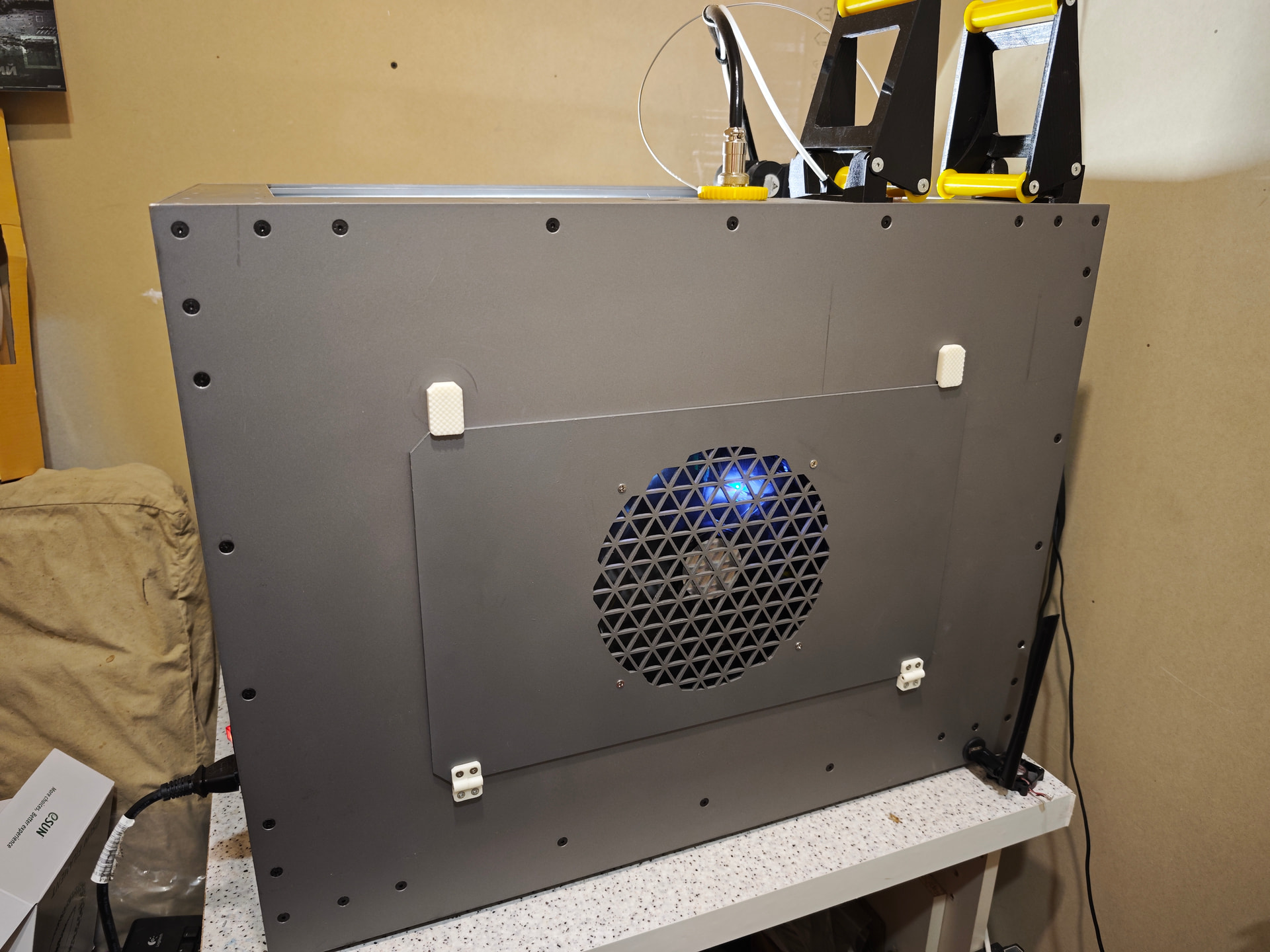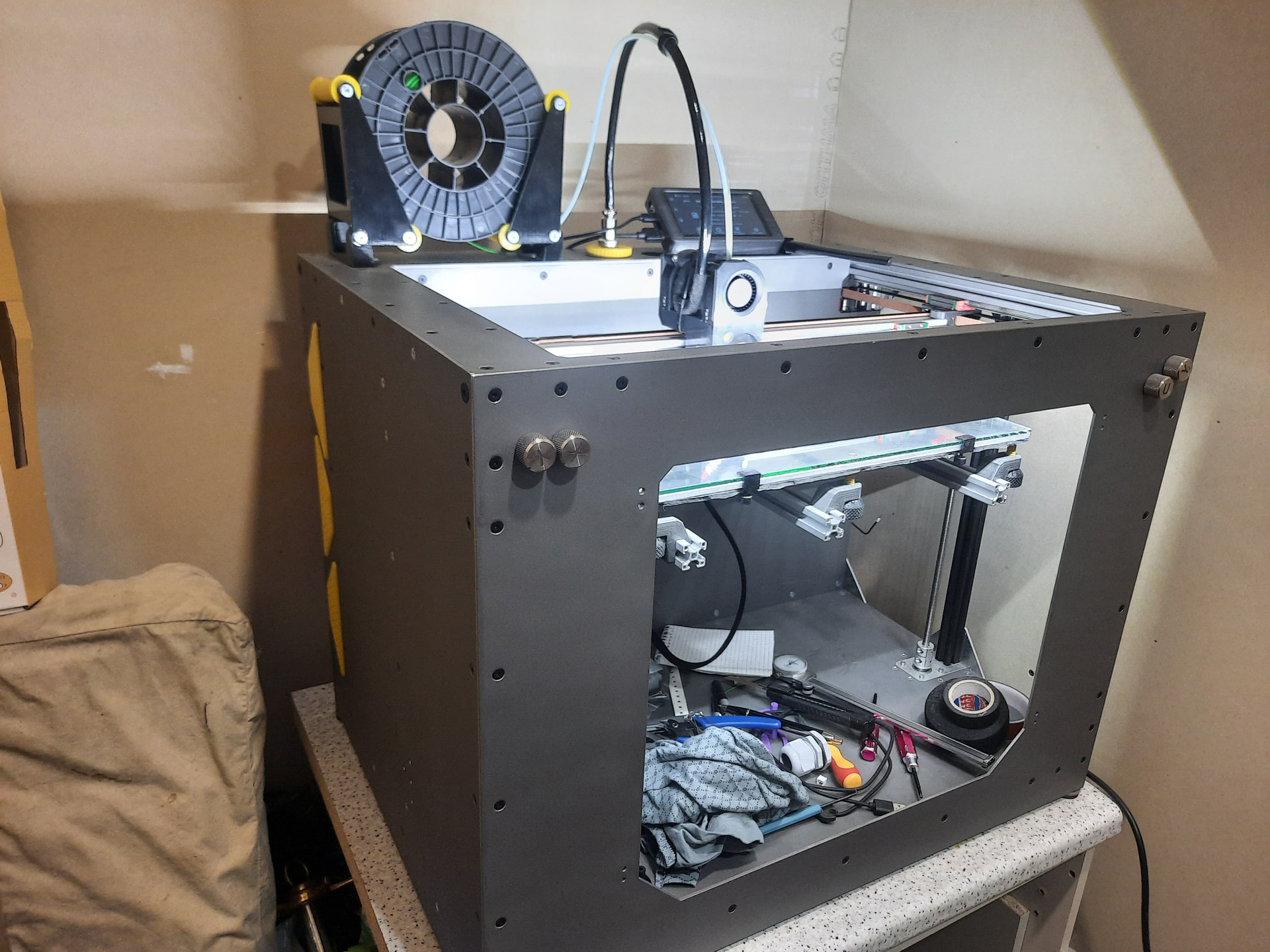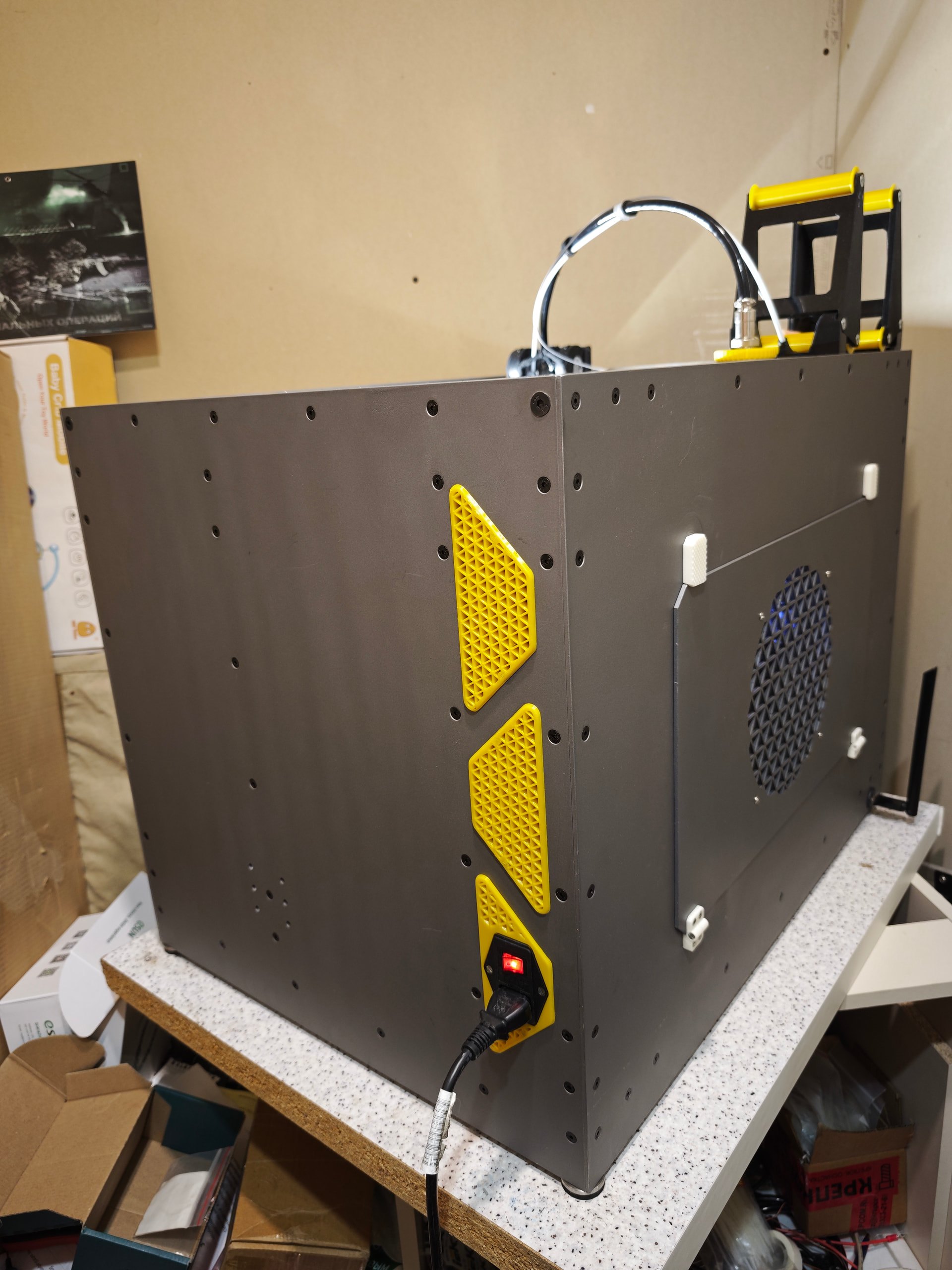 В Телеге народ упирал на то, что из-за хорошей теплопроводности алюминия, шкаф принтера будет горячий, а внутри холодно. С этим не согласен по нескольким причинам, основная - имел опыт работы с оборудованием, которое внутри далеко не холодное и корпус которого сделан из того же алюминия - корпус во время работы был тёплый, но ни как не горячий, а внутри корпуса атмосфера горячее, чем корпус, следовательно, внутри принтера всё будет нагреваться хорошо.